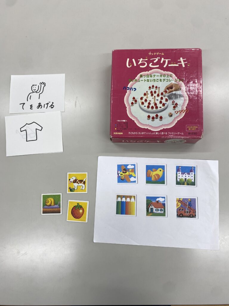 「絵あわせ」ではできるだけ早く同じものを見つけて6枚揃える、「なぞなぞ」では、概念や様子の言葉を聞いて該当するものを見つけるといった活動をしました。「できた」「ない」といった報告を自らする場面もあり、活気のある時間でした。