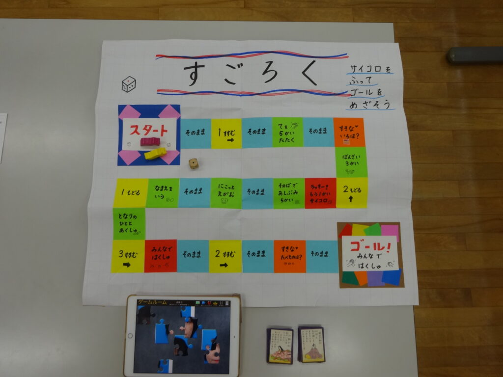 「お正月遊びでコミュニケーション」のテーマで、すごろく、かるた(ぼうずめくり)、iPadでふくわらい、プリントをしました。